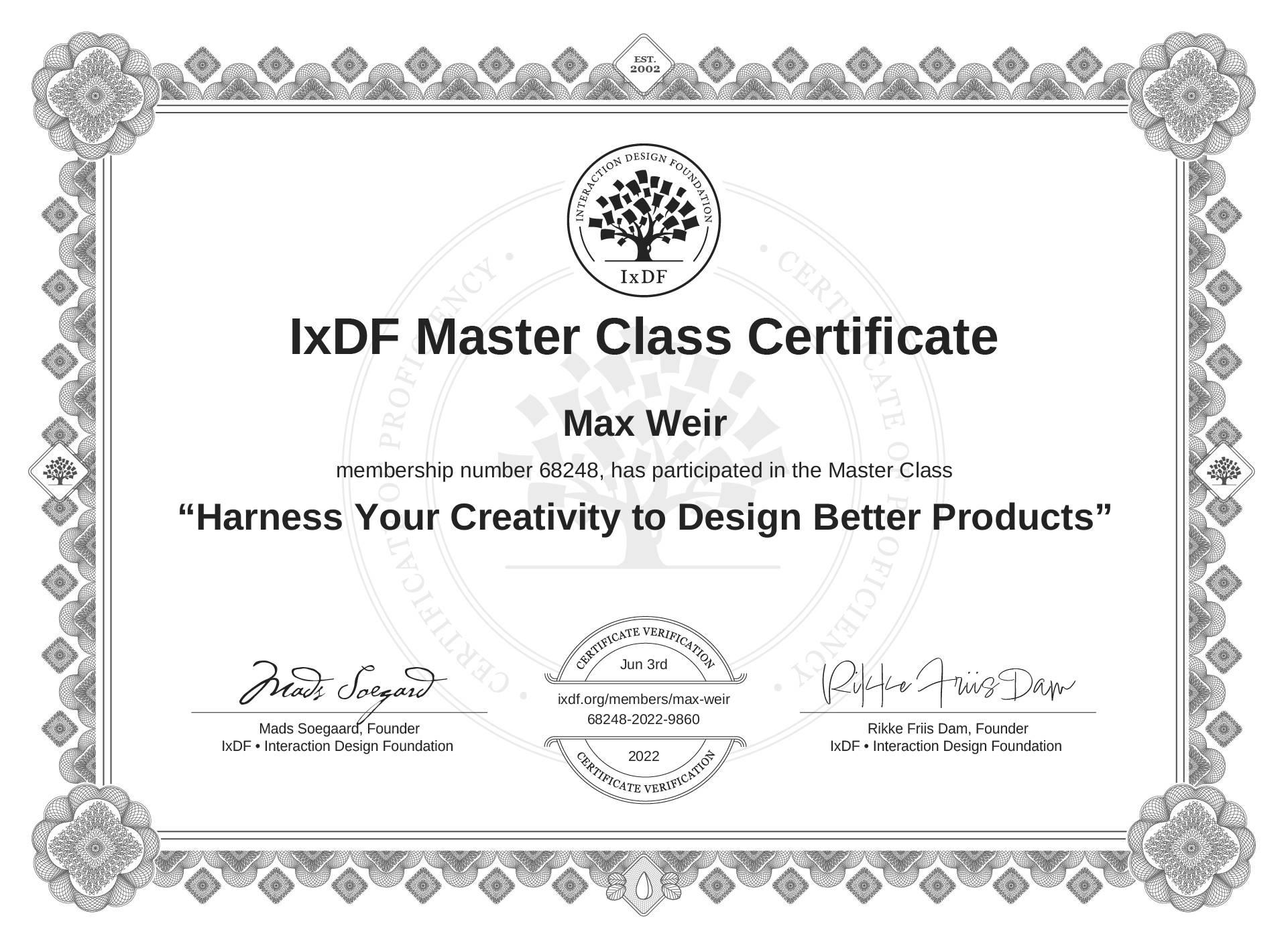 The IxDF Master Class Certificate (ID #mcc_2f1b2304f19d4d988e85f453eea7d0cf) above is awarded to Max Weir