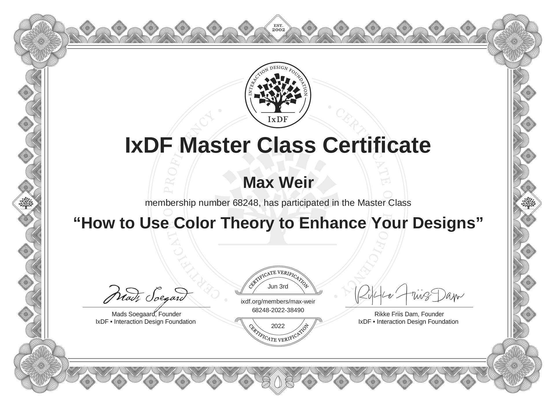 Max Weir's Masterclass Certificate: How to Use Color Theory to Enhance Your Designs