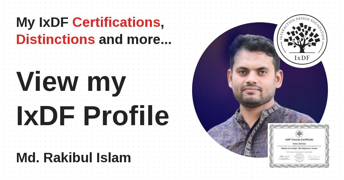 IxDF Course Certificates are awarded to Md. Rakibul Islam in formal recognition of their coursework surpassing the rigorous benchmarks of exceptional performance established by the IxDF Educational Codex.