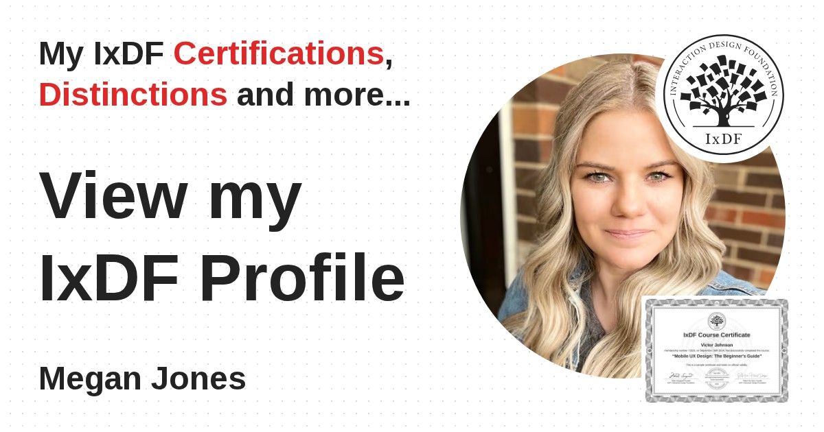 IxDF Course Certificates are awarded to Megan Jones in formal recognition of their coursework surpassing the rigorous benchmarks of exceptional performance established by the IxDF Educational Codex.