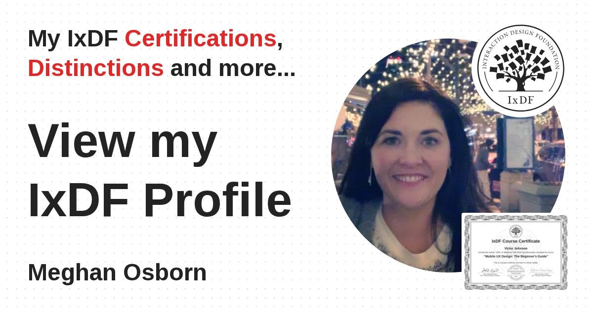 IxDF Course Certificates are awarded to Meghan Osborn in formal recognition of their coursework surpassing the rigorous benchmarks of exceptional performance established by the IxDF Educational Codex.