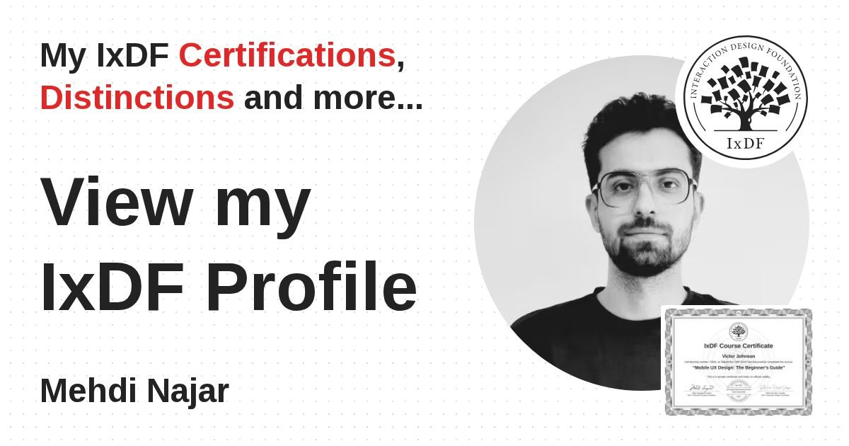 IxDF Course Certificates are awarded to Mehdi Najar in formal recognition of their coursework surpassing the rigorous benchmarks of exceptional performance established by the IxDF Educational Codex.