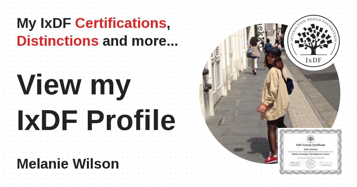 IxDF Course Certificates are awarded to Melanie Wilson in formal recognition of their coursework surpassing the rigorous benchmarks of exceptional performance established by the IxDF Educational Codex.