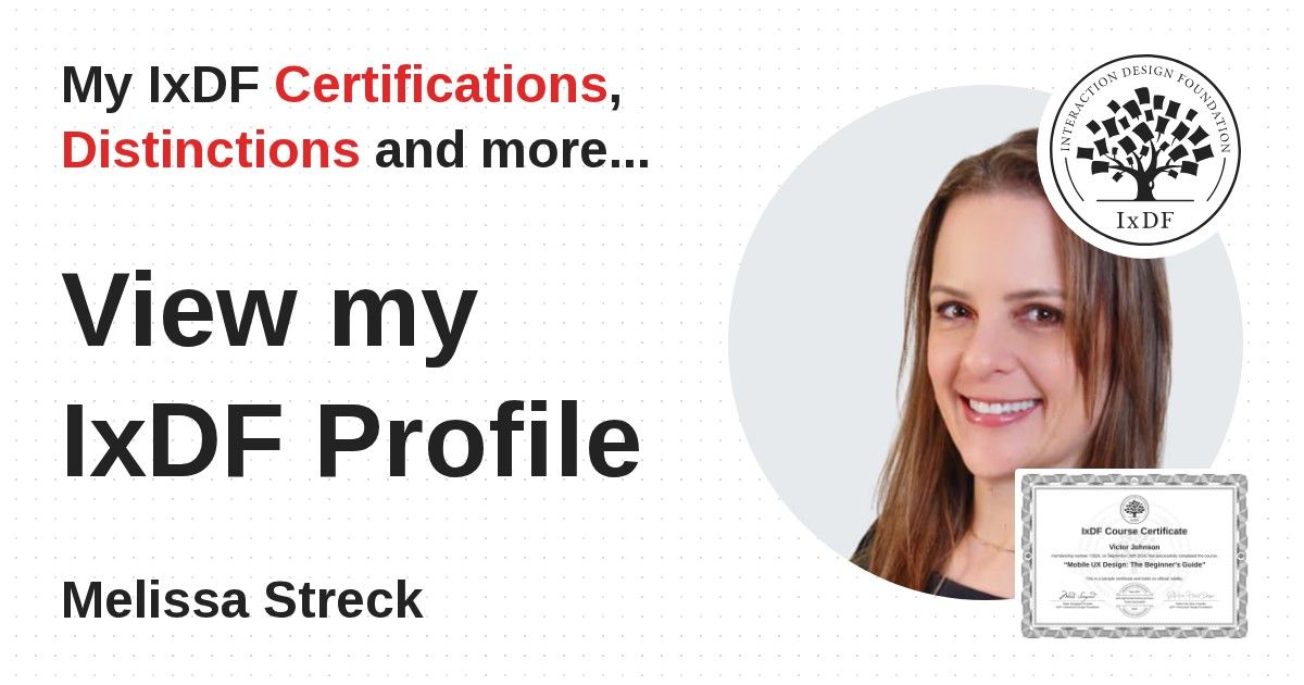 IxDF Course Certificates are awarded to Melissa Streck in formal recognition of their coursework surpassing the rigorous benchmarks of exceptional performance established by the IxDF Educational Codex.