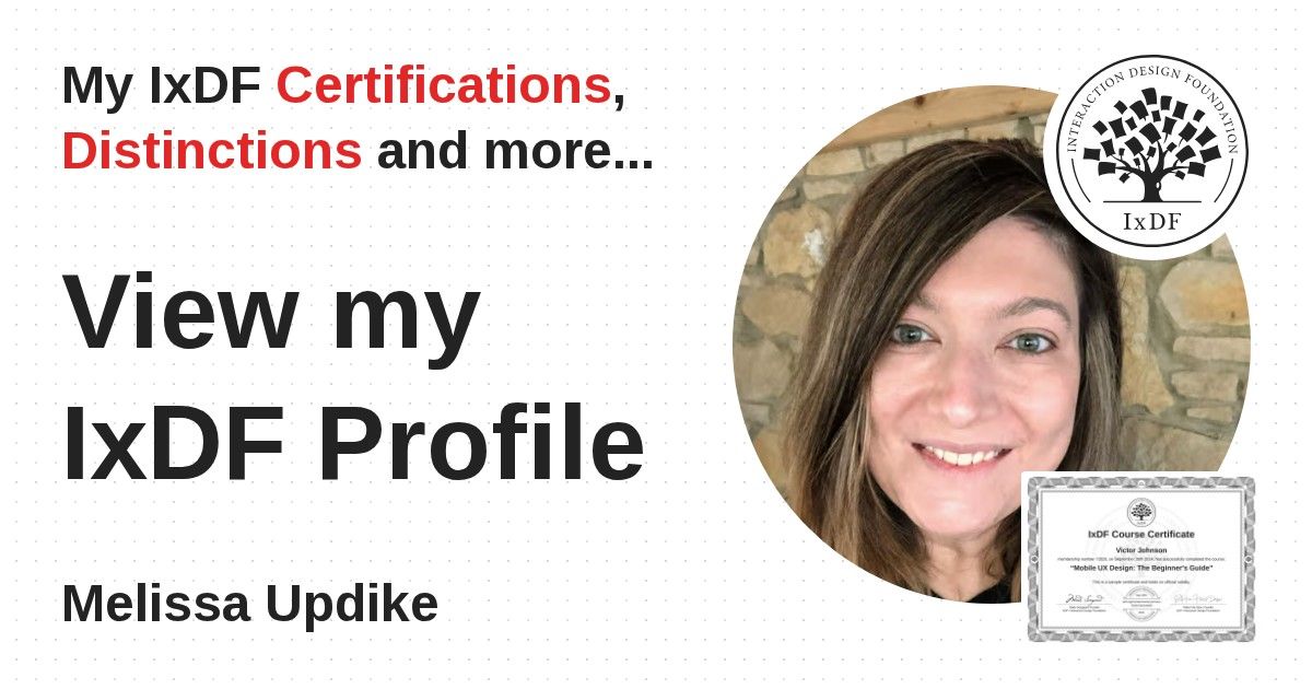 IxDF Course Certificates are awarded to Melissa Updike in formal recognition of their coursework surpassing the rigorous benchmarks of exceptional performance established by the IxDF Educational Codex.