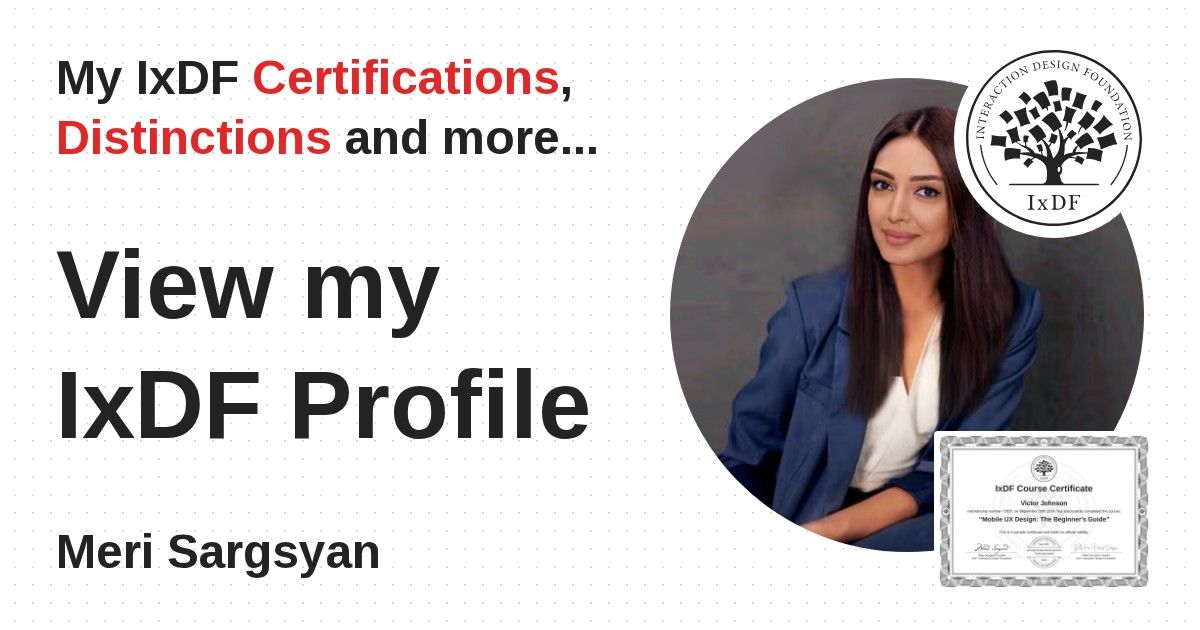 IxDF Course Certificates are awarded to Meri Sargsyan in formal recognition of their coursework surpassing the rigorous benchmarks of exceptional performance established by the IxDF Educational Codex.