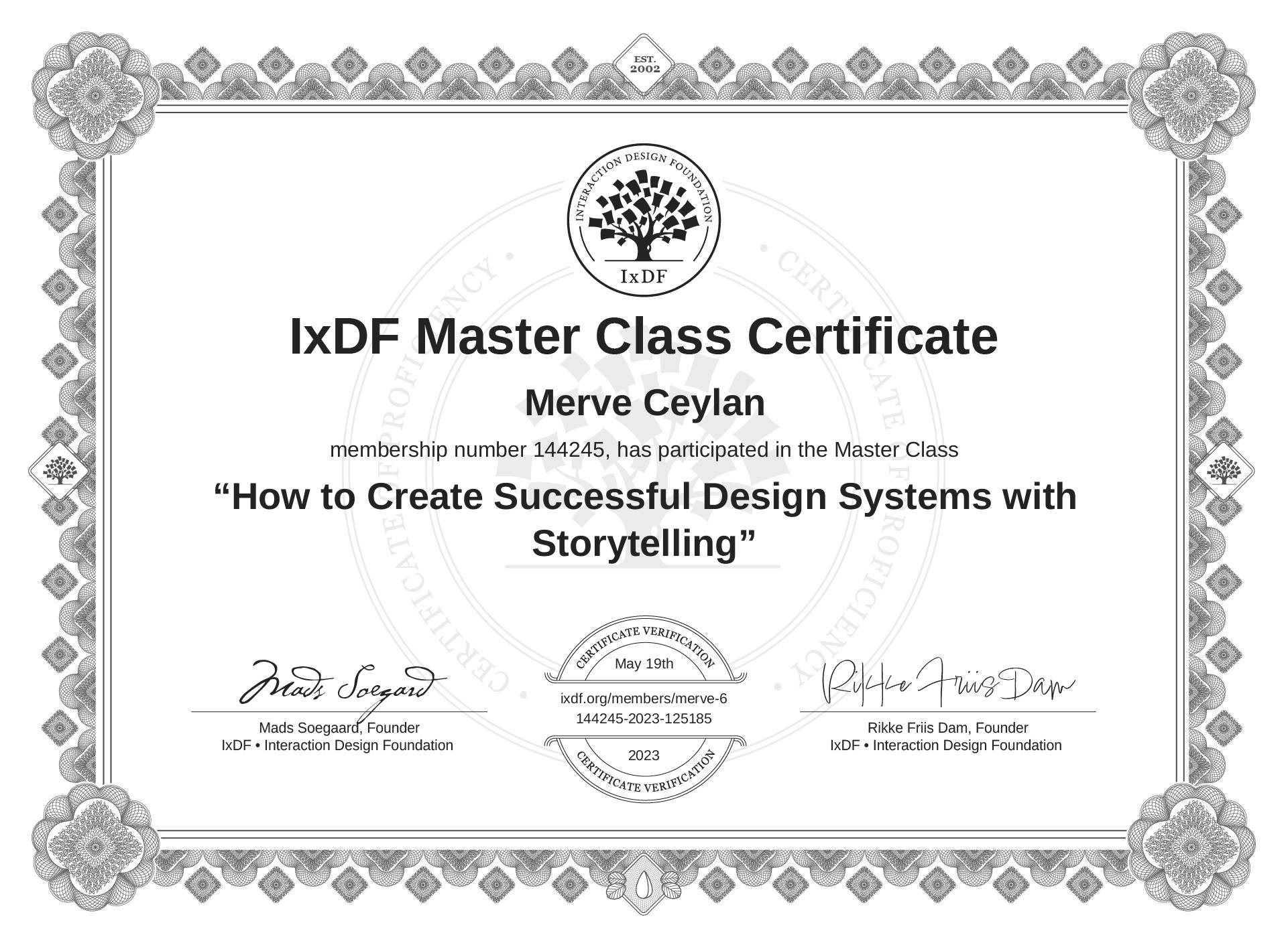 The IxDF Master Class Certificate (ID #mcc_955d2f9214e345a994bd46383879be30) above is awarded to Merve Ceylan in formal recognition of their participation in the Master Class How to Create Successful Design Systems with Storytelling .