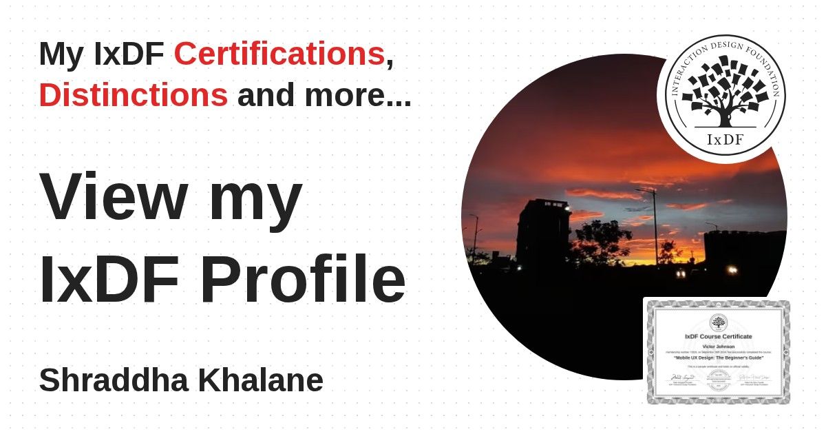 IxDF Course Certificates are awarded to Shraddha Khalane in formal recognition of their coursework surpassing the rigorous benchmarks of exceptional performance established by the IxDF Educational Codex.