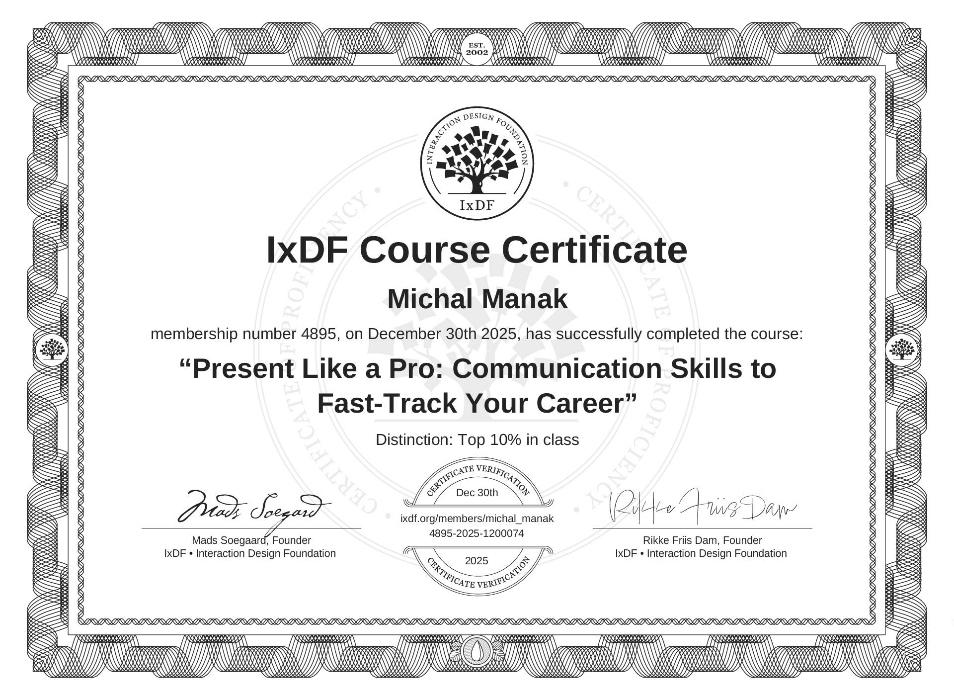 The IxDF Course Certificate (ID #7a4cbfdf-1035-494e-9bde-a7a748673823) above is awarded to Michal Manak