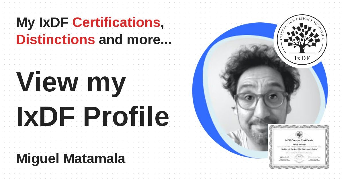 IxDF Course Certificates are awarded to Miguel Matamala in formal recognition of their coursework surpassing the rigorous benchmarks of exceptional performance established by the IxDF Educational Codex.