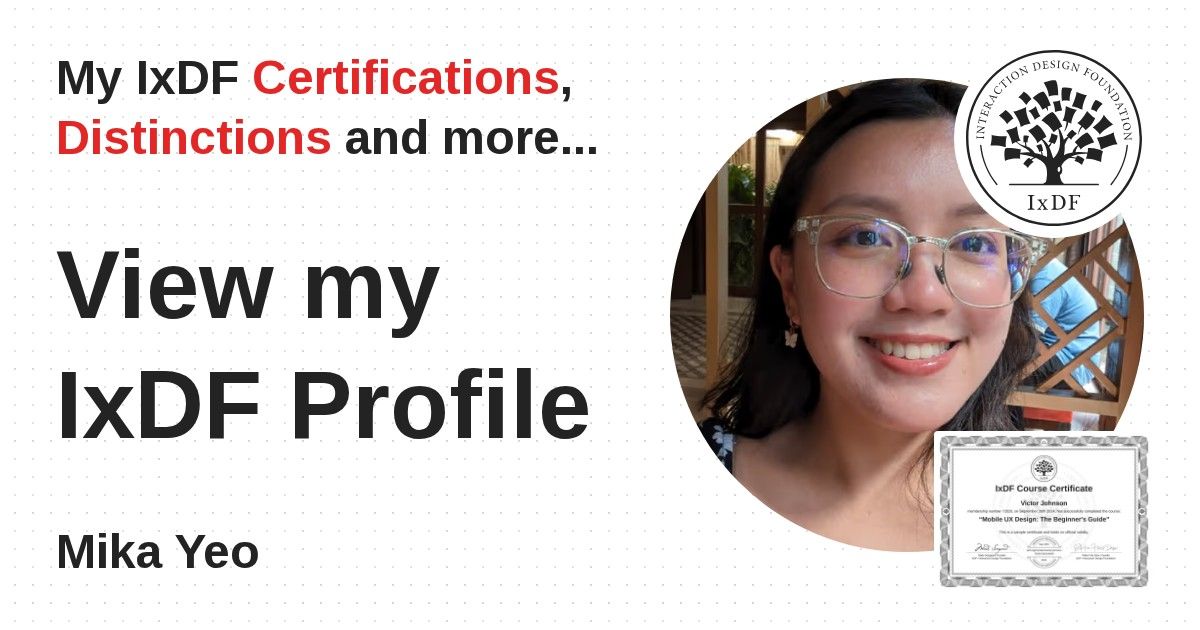 IxDF Course Certificates are awarded to Mika Yeo in formal recognition of their coursework surpassing the rigorous benchmarks of exceptional performance established by the IxDF Educational Codex.