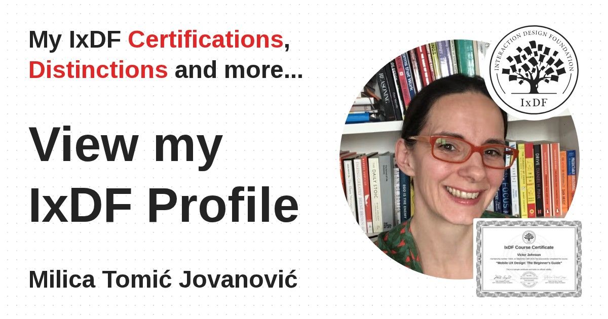 IxDF Course Certificates are awarded to Milica Tomić Jovanović in formal recognition of their coursework surpassing the rigorous benchmarks of exceptional performance established by the IxDF Educational Codex.
