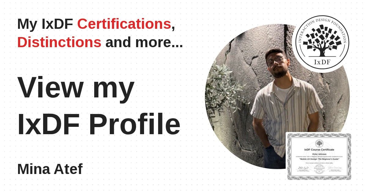IxDF Course Certificates are awarded to Mina Atef in formal recognition of their coursework surpassing the rigorous benchmarks of exceptional performance established by the IxDF Educational Codex.