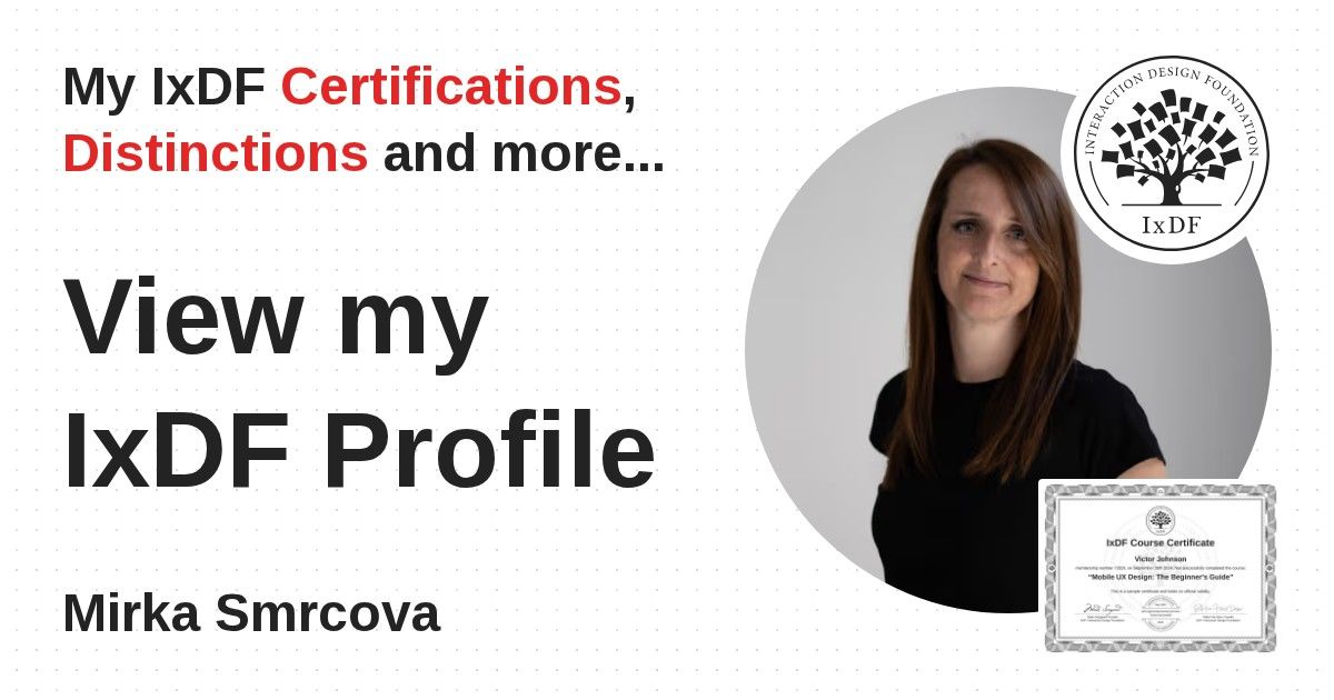 IxDF Course Certificates are awarded to Mirka Smrcova in formal recognition of their coursework surpassing the rigorous benchmarks of exceptional performance established by the IxDF Educational Codex.