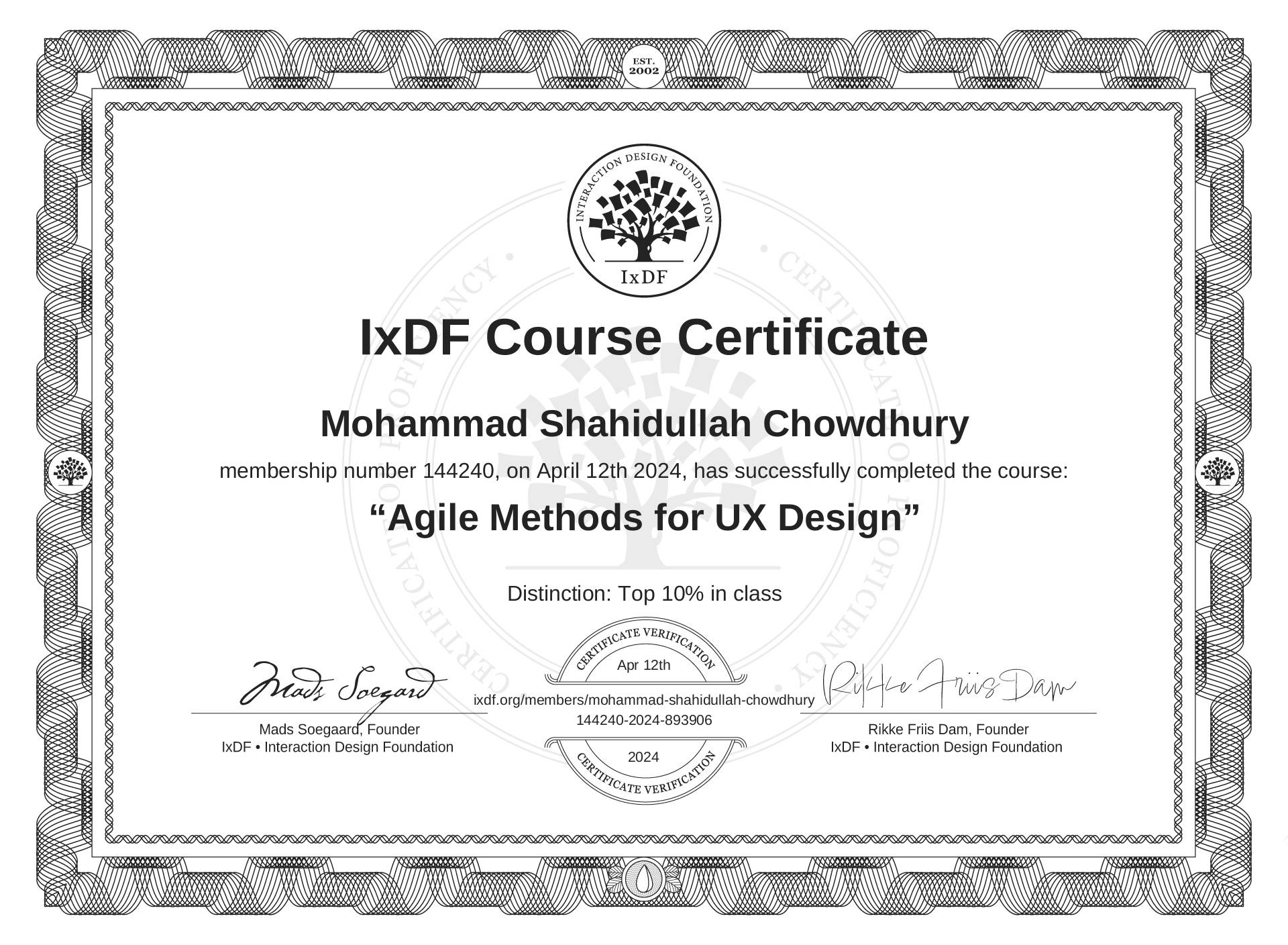 The IxDF Course Certificate (ID #5b87fdcb-885f-4826-8709-e88ae3a16288) above is awarded to Mohammad Shahidullah Chowdhury