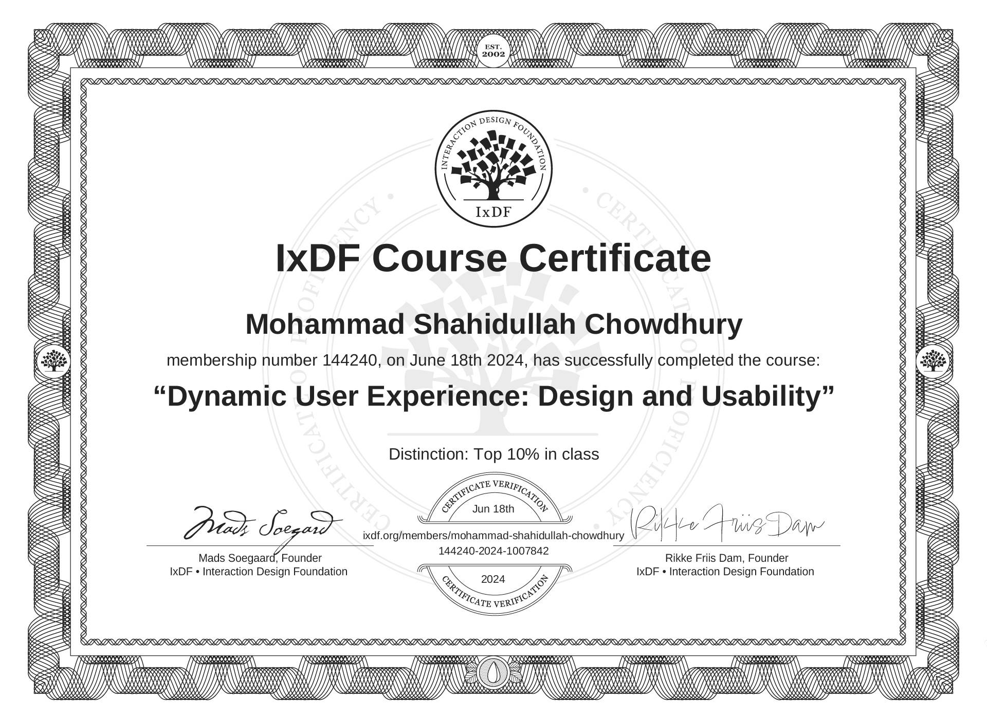 The IxDF Course Certificate (ID #895e7a43-3fe8-4a4f-a324-45d4c172a2a7) above is awarded to Mohammad Shahidullah Chowdhury
