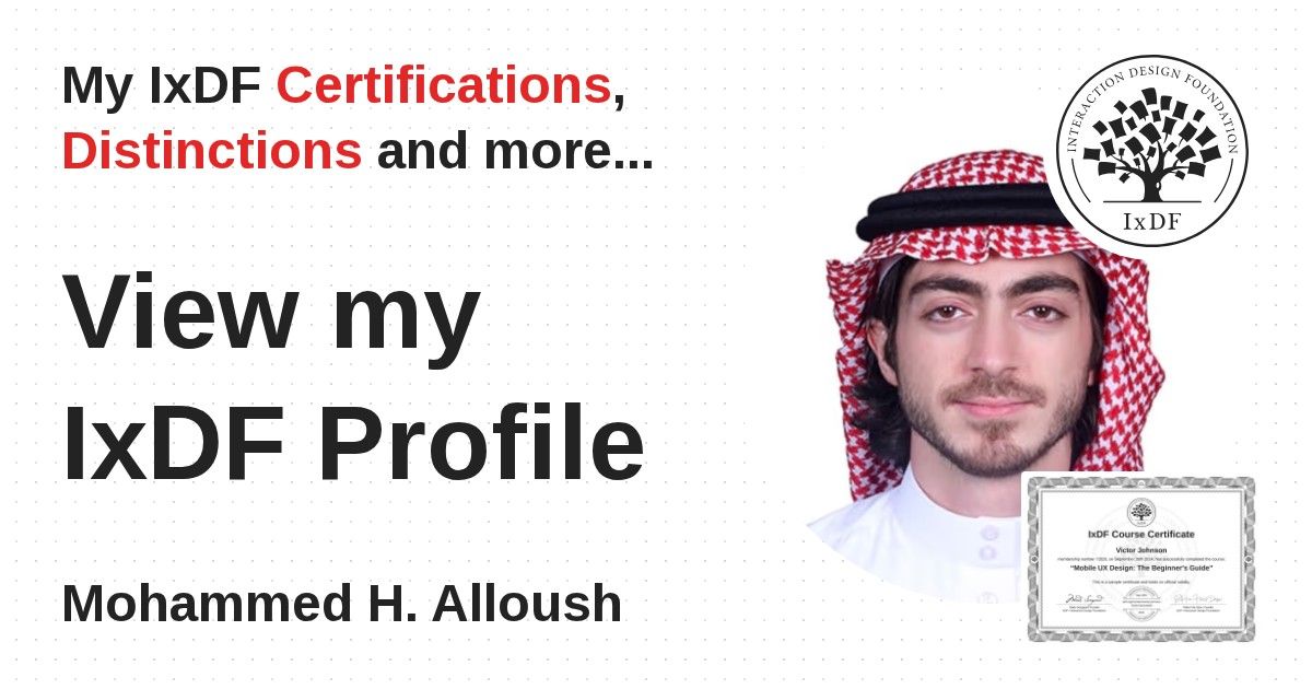 IxDF Course Certificates are awarded to Mohammed H. Alloush in formal recognition of their coursework surpassing the rigorous benchmarks of exceptional performance established by the IxDF Educational Codex.