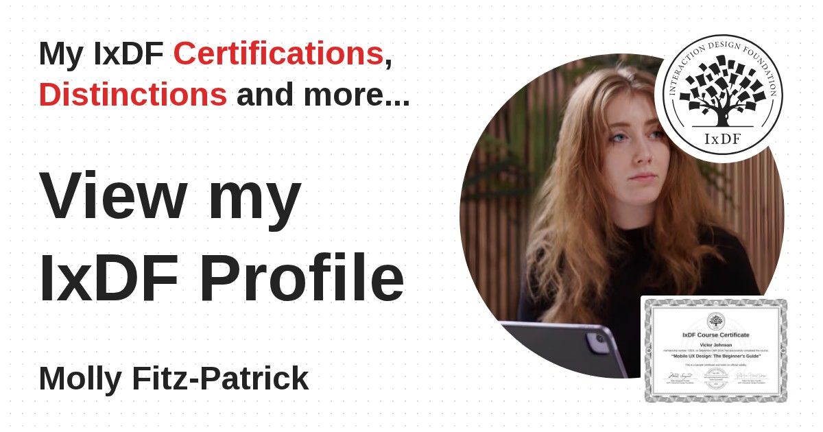 IxDF Course Certificates are awarded to Molly Fitz-Patrick in formal recognition of their coursework surpassing the rigorous benchmarks of exceptional performance established by the IxDF Educational Codex.