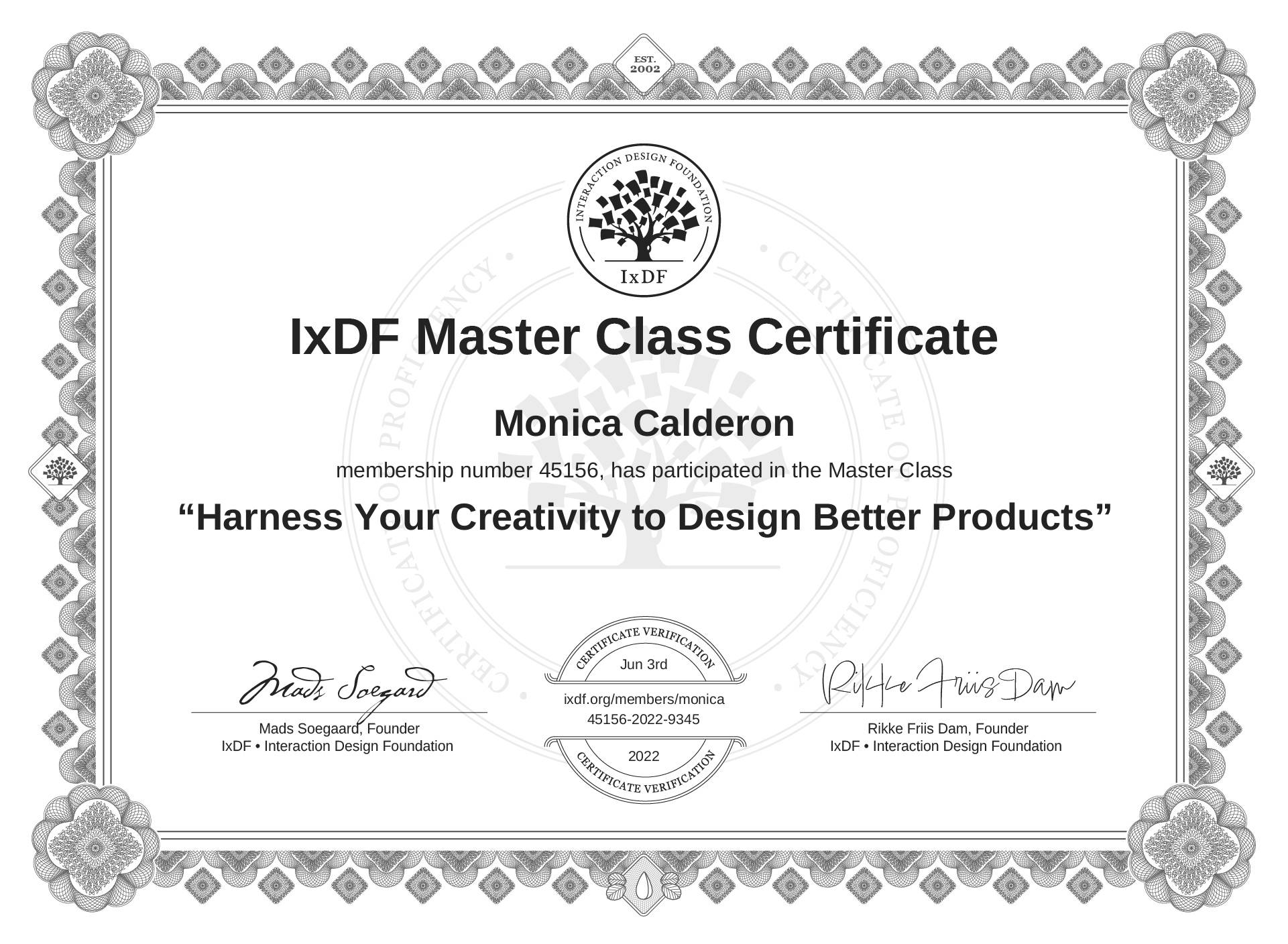 IxDF Master Class Certificate awarded to Monica Calderon for attending the "Harness Your Creativity to Design Better Products" Master Class