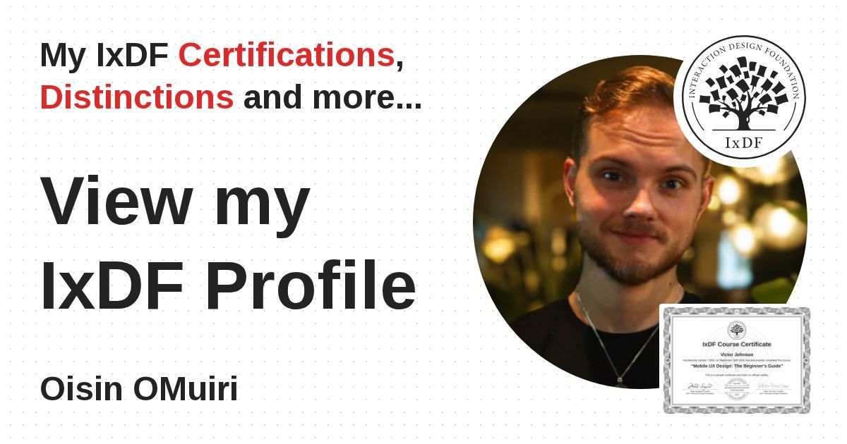 IxDF Course Certificates are awarded to Oisin OMuiri in formal recognition of their coursework surpassing the rigorous benchmarks of exceptional performance established by the IxDF Educational Codex.