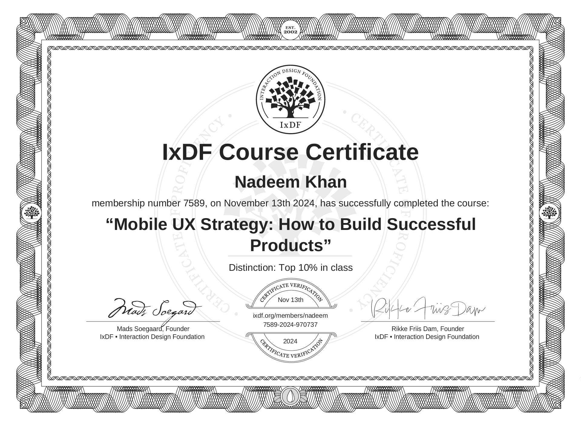 IxDF Course Certificates are awarded to Nadeem Khan in formal recognition of their coursework surpassing the rigorous benchmarks of exceptional performance established by the IxDF Educational Codex.