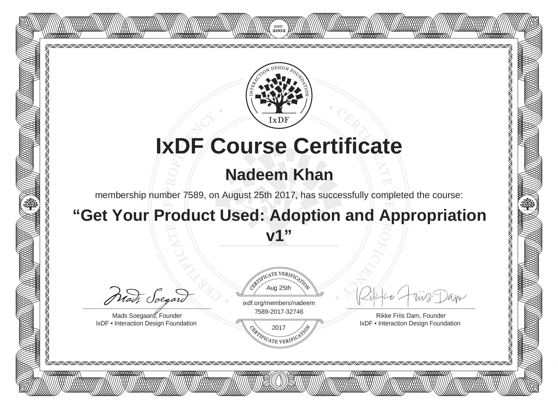 IxDF Course Certificate awarded to Nadeem Khan for completing the "Get Your Product Used: Adoption and Appropriation v1" course