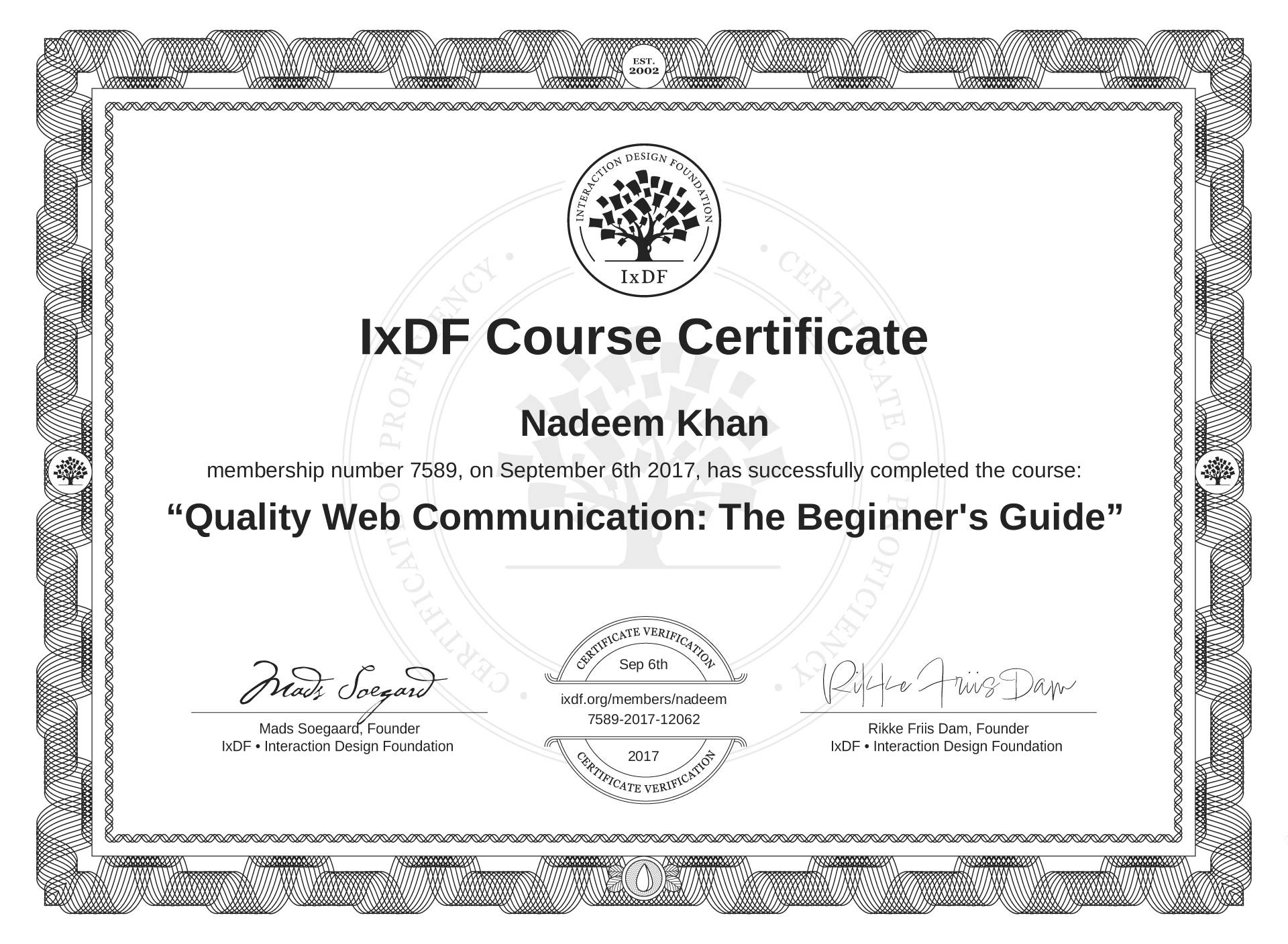IxDF Course Certificate awarded to Nadeem Khan for completing the "Quality Web Communication: The Beginner's Guide" course