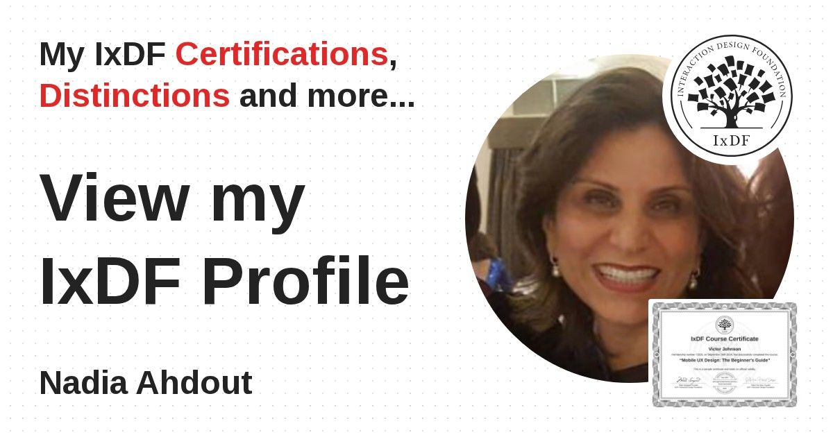 IxDF Course Certificates are awarded to Nadia Ahdout in formal recognition of their coursework surpassing the rigorous benchmarks of exceptional performance established by the IxDF Educational Codex.