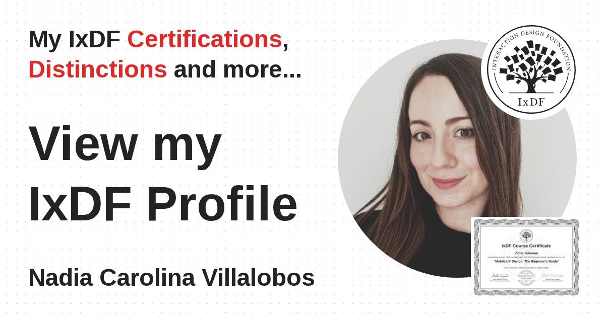 IxDF Course Certificates are awarded to Nadia Carolina Villalobos in formal recognition of their coursework surpassing the rigorous benchmarks of exceptional performance established by the IxDF Educational Codex.