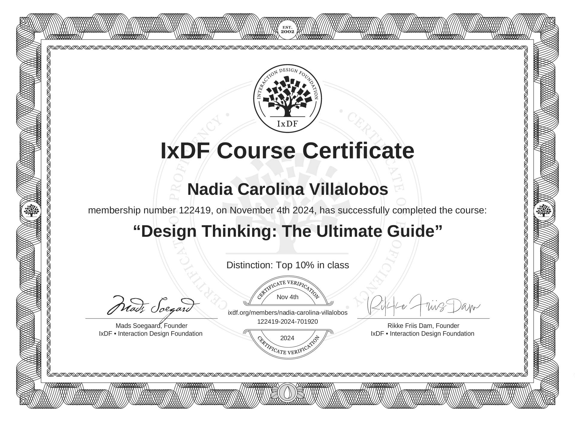 The IxDF Course Certificate (ID #a7c96079-e1f8-4ff5-9ab0-d7dc33daccae) above is awarded to Nadia Carolina Villalobos with a Top 10% Distinction in formal recognition of their coursework surpassing the rigorous benchmarks of exceptional performance established by the IxDF Educational Codex. View Course Curriculum.