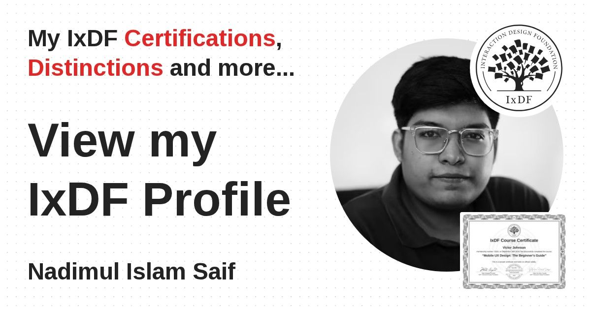 IxDF Course Certificates are awarded to Nadimul Islam Saif in formal recognition of their coursework surpassing the rigorous benchmarks of exceptional performance established by the IxDF Educational Codex.