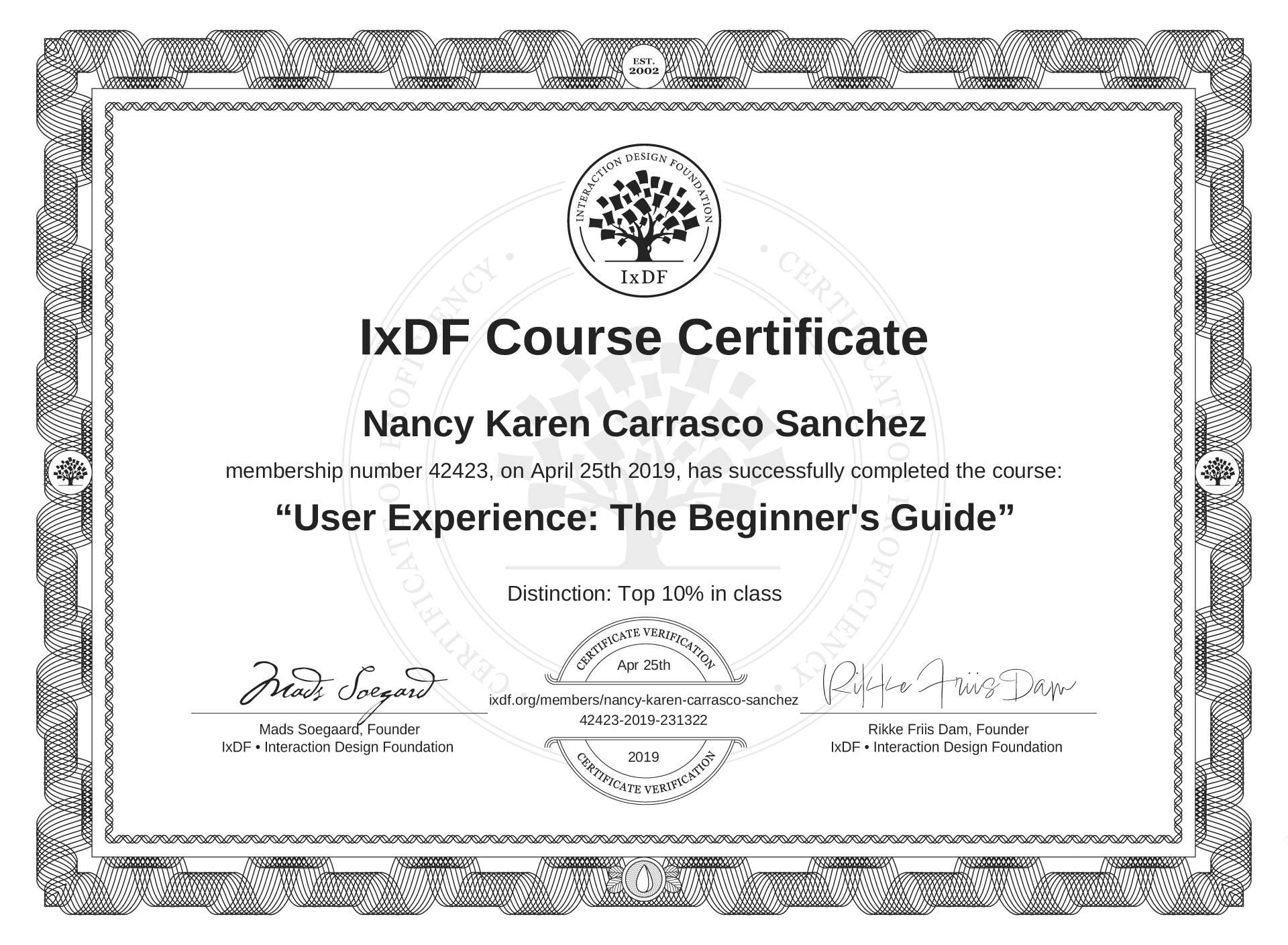 The IxDF Course Certificate (ID #PLFJP20Qd) above is awarded to Nancy Karen Carrasco Sanchez with a Top 10% Distinction in formal recognition of their coursework surpassing the rigorous benchmarks of exceptional performance established by the IxDF Educational Codex. View Course Curriculum.