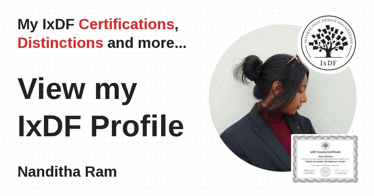 IxDF Course Certificates are awarded to Nanditha Ram in formal recognition of their coursework surpassing the rigorous benchmarks of exceptional performance established by the IxDF Educational Codex.