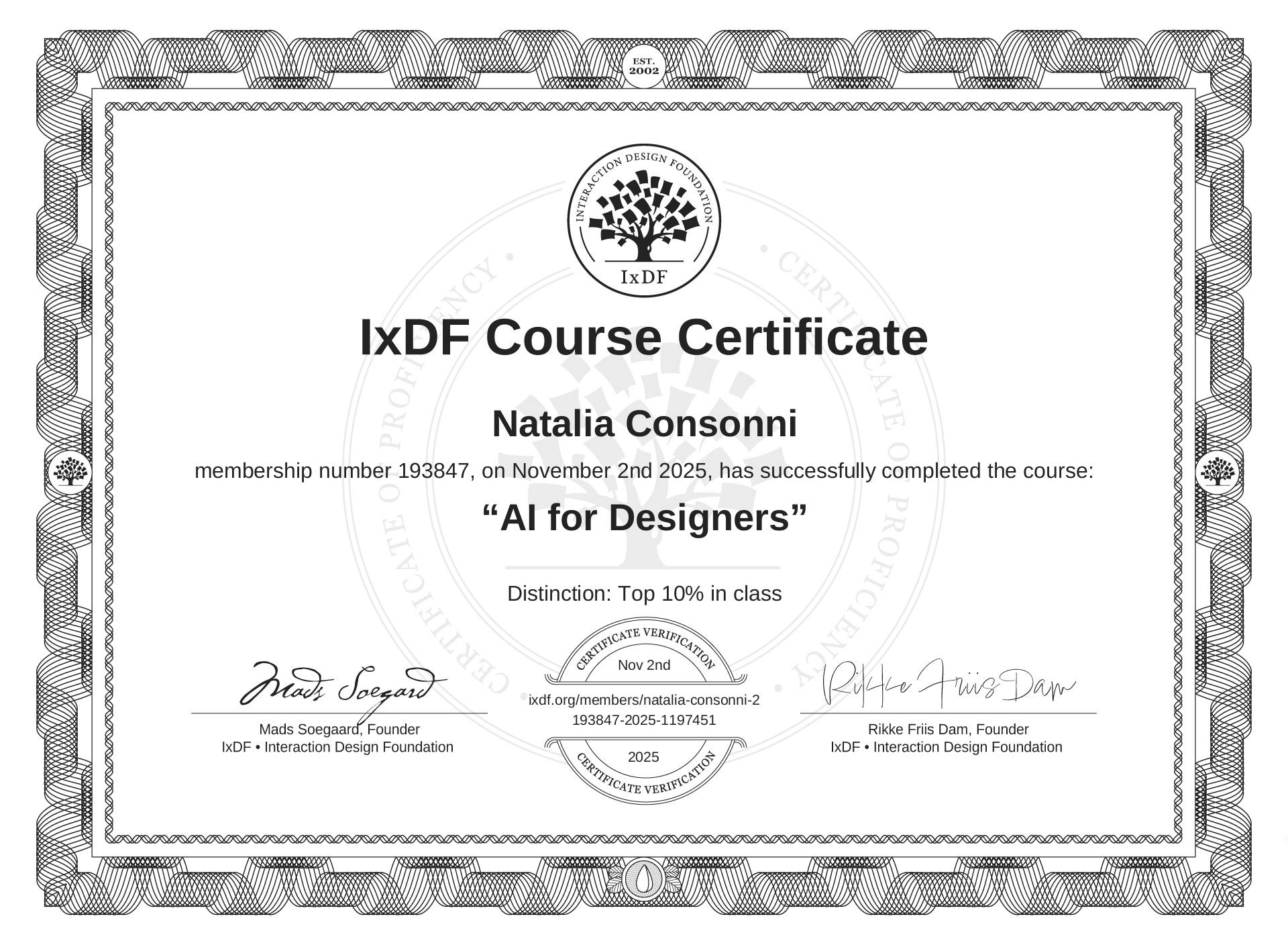 This IxDF Membership Certificate is issued to Natalia Consonni