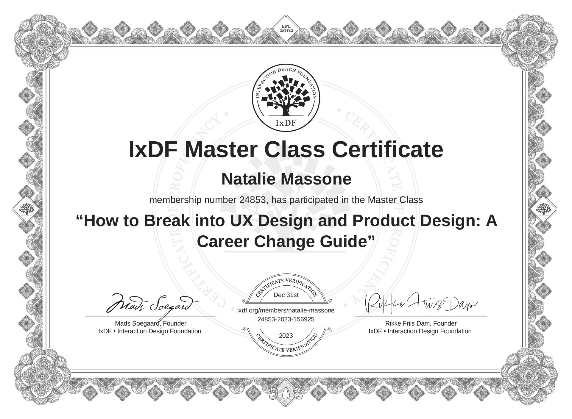 The IxDF Master Class Certificate (ID #mcc_9fb69ae0474f4f48a250484f3d1fa5b1) above is awarded to Natalie Massone in formal recognition of their participation in the Master Class How to Break into UX Design and Product Design: A Career Change Guide .