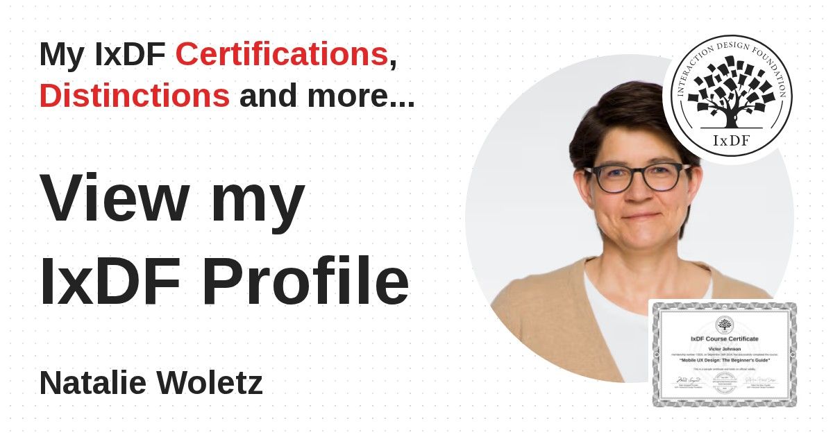 IxDF Course Certificates are awarded to Natalie Woletz in formal recognition of their coursework surpassing the rigorous benchmarks of exceptional performance established by the IxDF Educational Codex.