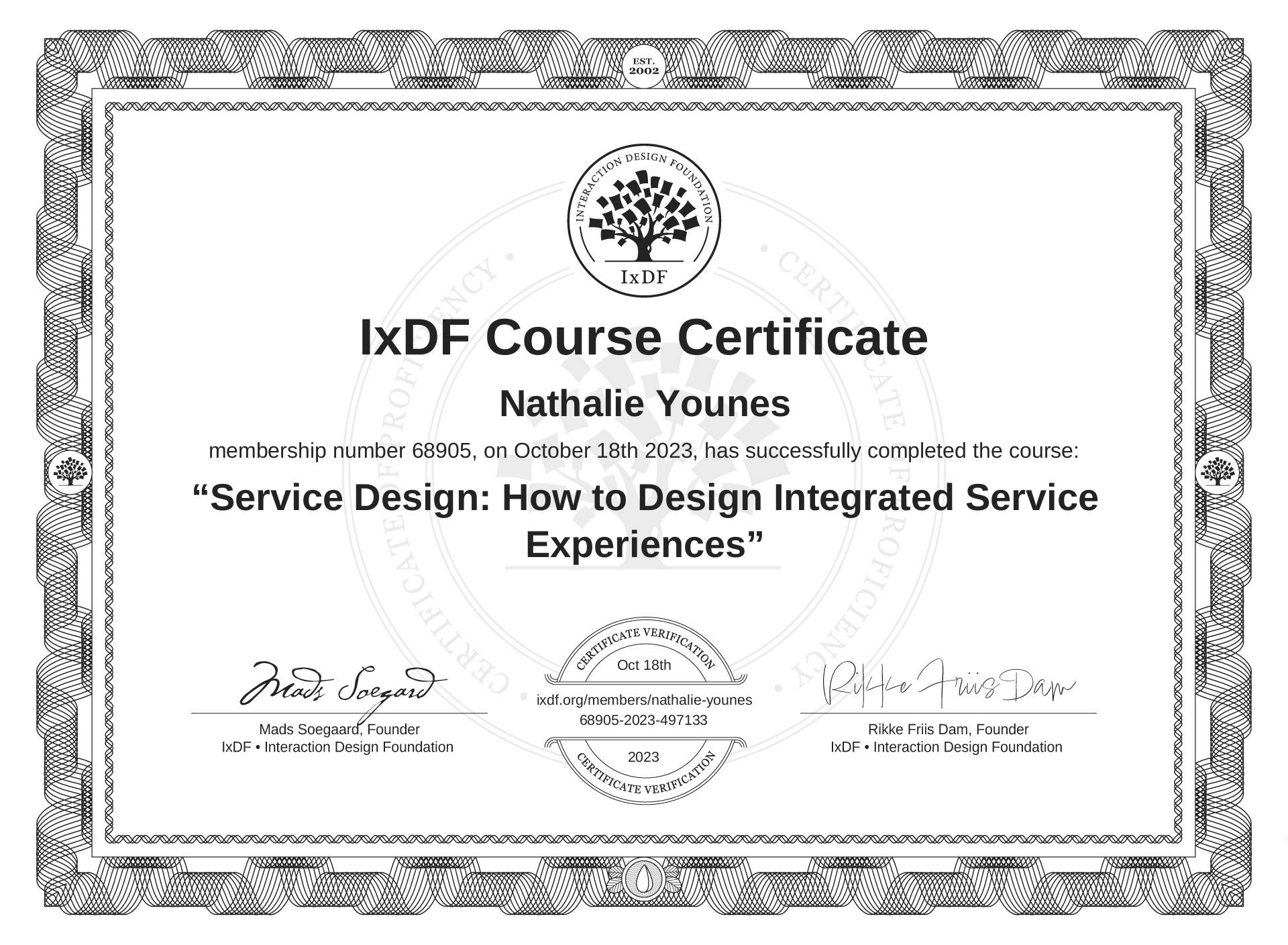 The IxDF Course Certificate (ID #1969d036-8a6c-45f1-a416-853e9ecb1498) above is awarded to Nathalie Younes in formal recognition of their coursework surpassing the rigorous benchmarks of exceptional performance established by the IxDF Educational Codex. View Course Curriculum.