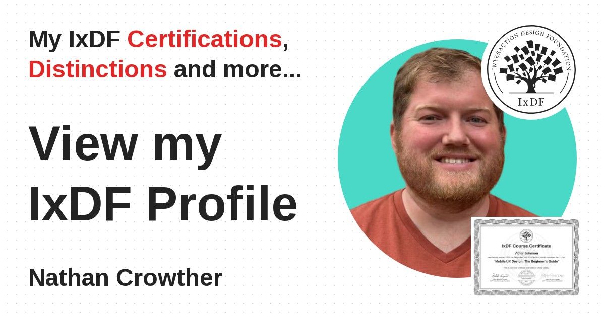 IxDF Course Certificates are awarded to Nathan Crowther in formal recognition of their coursework surpassing the rigorous benchmarks of exceptional performance established by the IxDF Educational Codex.
