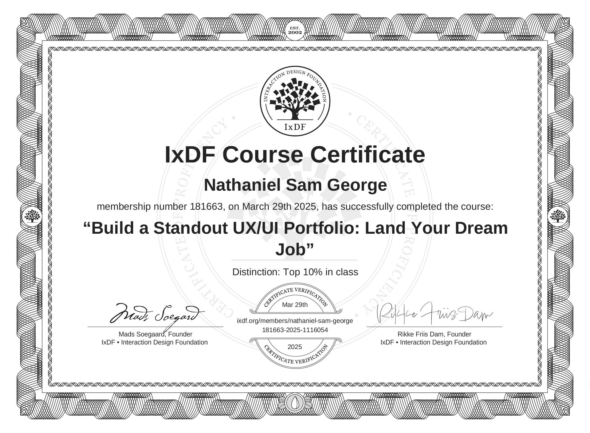 This IxDF Membership Certificate is issued to Nathaniel Sam George