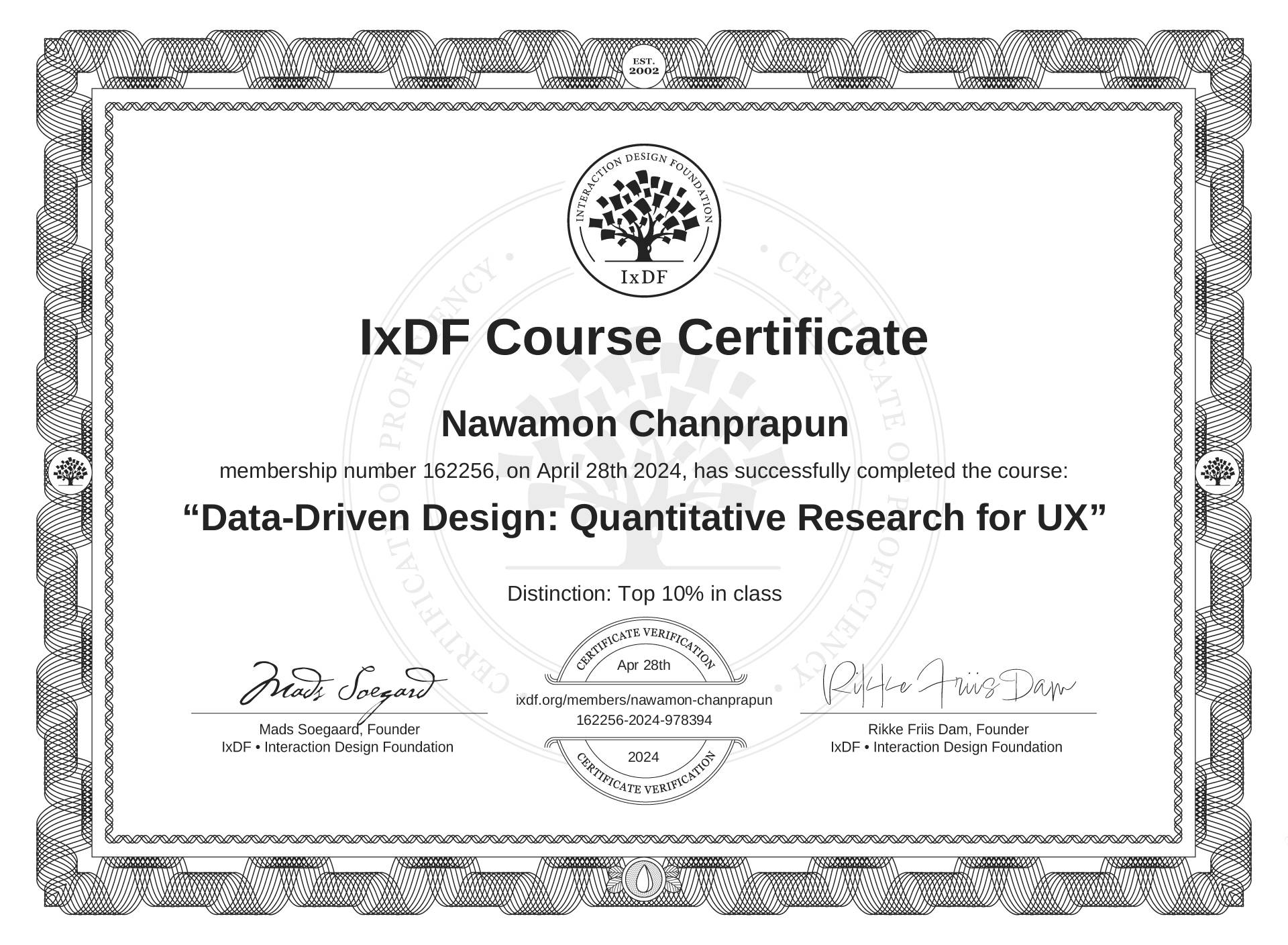 The IxDF Course Certificate (ID #8535e5c3-4f5b-45e6-9136-71e43ab3c514) above is awarded to Nawamon Chanprapun with a Top 10% Distinction in formal recognition of their coursework surpassing the rigorous benchmarks of exceptional performance established by the IxDF Educational Codex. View Course Curriculum.