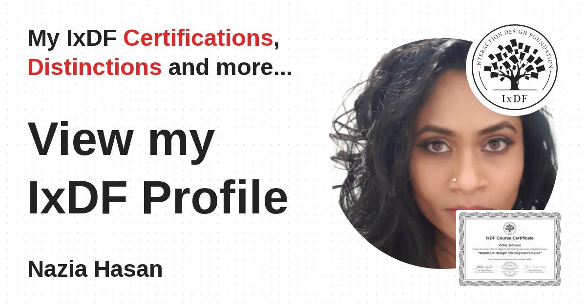 IxDF Course Certificates are awarded to Nazia Hasan in formal recognition of their coursework surpassing the rigorous benchmarks of exceptional performance established by the IxDF Educational Codex.