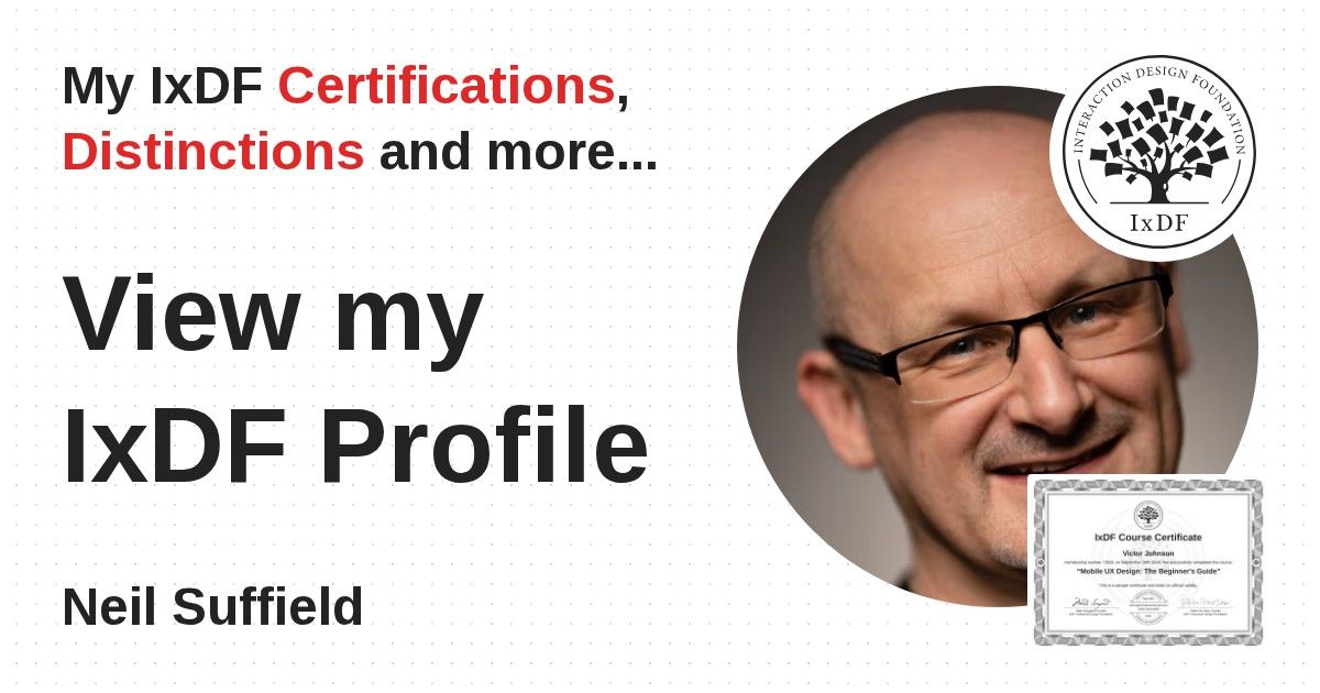 IxDF Course Certificates are awarded to Neil Suffield in formal recognition of their coursework surpassing the rigorous benchmarks of exceptional performance established by the IxDF Educational Codex.