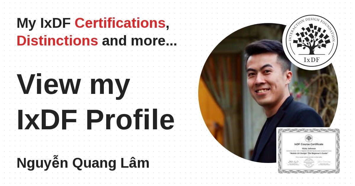 IxDF Course Certificates are awarded to Nguyễn Quang Lâm in formal recognition of their coursework surpassing the rigorous benchmarks of exceptional performance established by the IxDF Educational Codex.