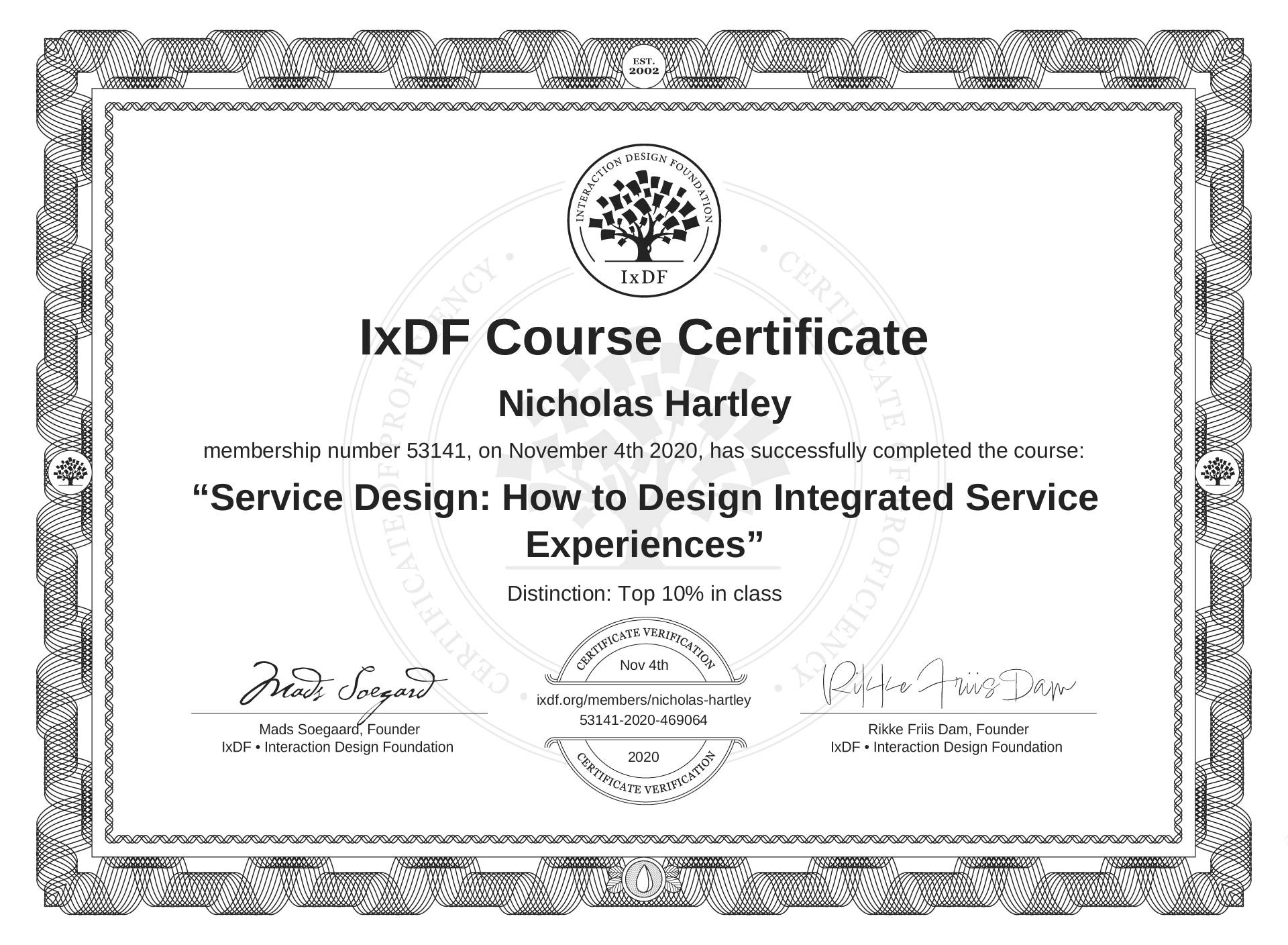 The IxDF Course Certificate (ID #97b4c40a-bb2a-4071-b6bc-cfe770194fcc) above is awarded to Nicholas Hartley with a Top 10% Distinction in formal recognition of their coursework surpassing the rigorous benchmarks of exceptional performance established by the IxDF Educational Codex. View Course Curriculum.