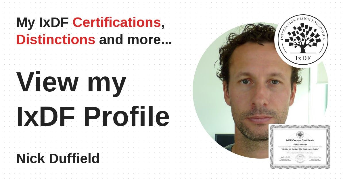 IxDF Course Certificates are awarded to Nick Duffield in formal recognition of their coursework surpassing the rigorous benchmarks of exceptional performance established by the IxDF Educational Codex.