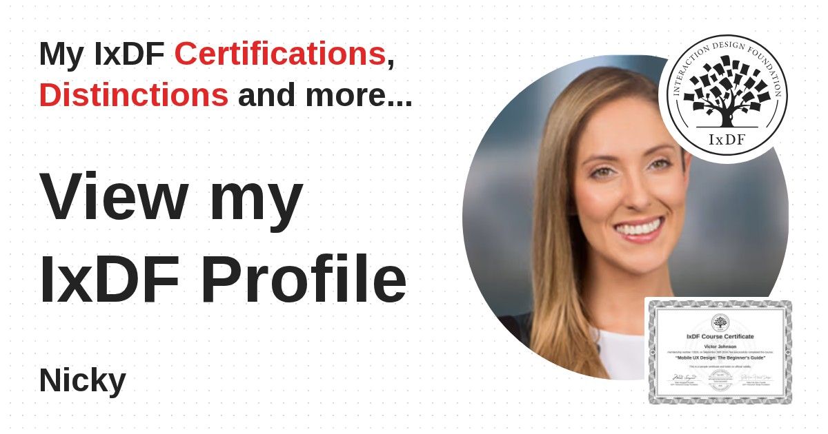 IxDF Course Certificates are awarded to Nicky in formal recognition of their coursework surpassing the rigorous benchmarks of exceptional performance established by the IxDF Educational Codex.
