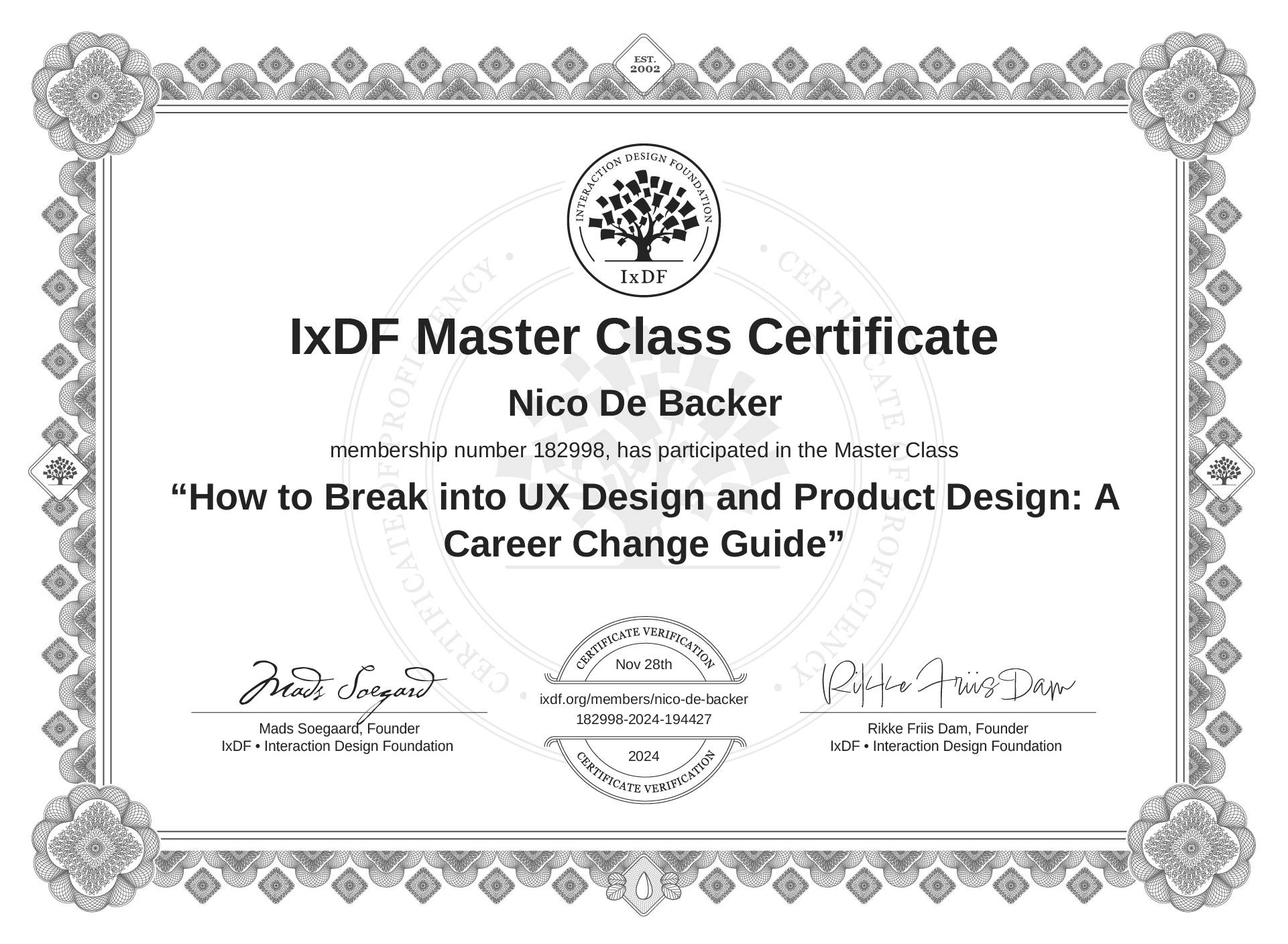 The IxDF Master Class Certificate (ID #mcc_b7de59e75bda47d2a1eaac826da3dcbd) above is awarded to Nico De Backer in formal recognition of their participation in the Master Class How to Break into UX Design and Product Design: A Career Change Guide .