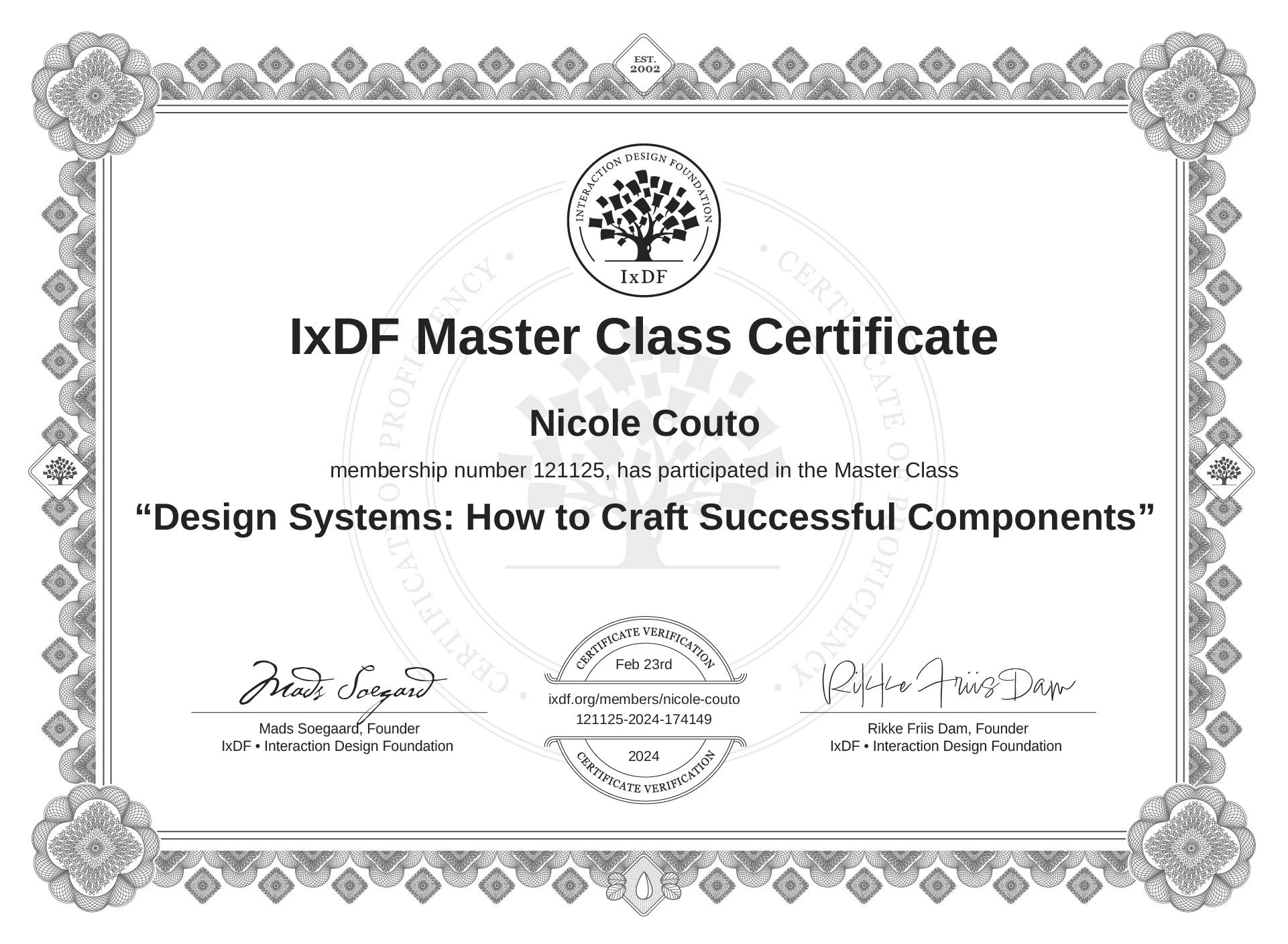 The IxDF Master Class Certificate (ID #mcc_dd511165232f48ce8817585ec81e0f56) above is awarded to Nicole Couto