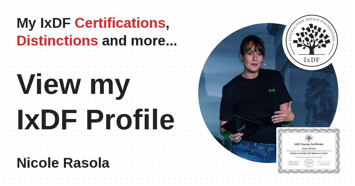 Distinctions are conferred upon Nicole Rasola in formal recognition of their notable achievements and contributions, as stipulated by the IxDF Educational Codex.