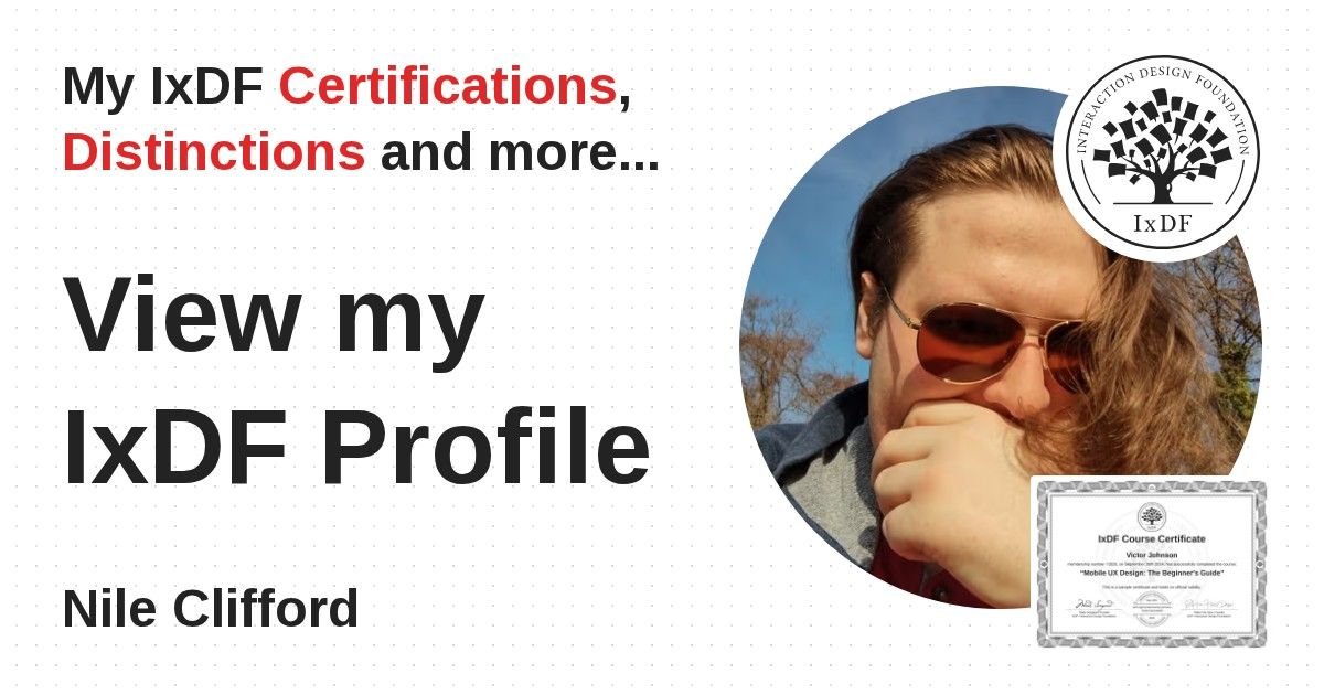 IxDF Course Certificates are awarded to Nile Clifford in formal recognition of their coursework surpassing the rigorous benchmarks of exceptional performance established by the IxDF Educational Codex.